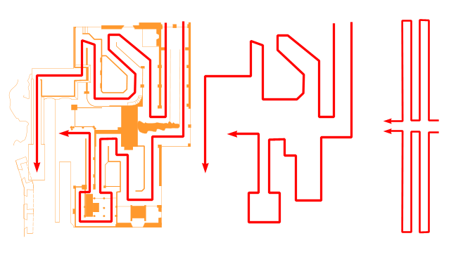 How themeing obscures function:Left: Pirates queue top down view. Middle: Pirates queue with walls removed