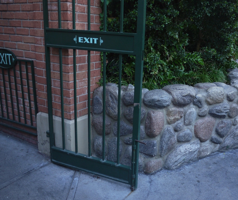 Disneyland built things where it could, and so very often buildings are dropped down perfunctorily, only very rarely placed to achieve any specific pictorial effect. Depending on where you are, there can be three levels of themed design occurring around you on different registers. This makes Disneyland visually dense while retaining a somewhat prosaic thematic effect. This is what people mean when they say Disneyland is charming: it's a massive pile of ideas slammed down, one atop the other, with very little room to spare. This means that it's very common to find areas where one kind of texture or surface treatment just ends because it collides with another. This is what I mean when I say Disneyland is naive.