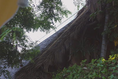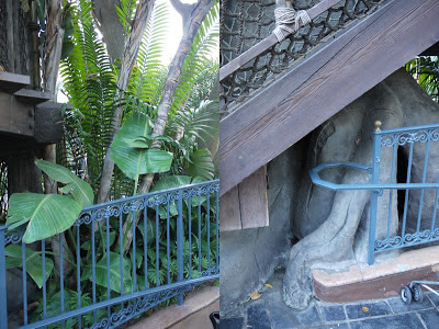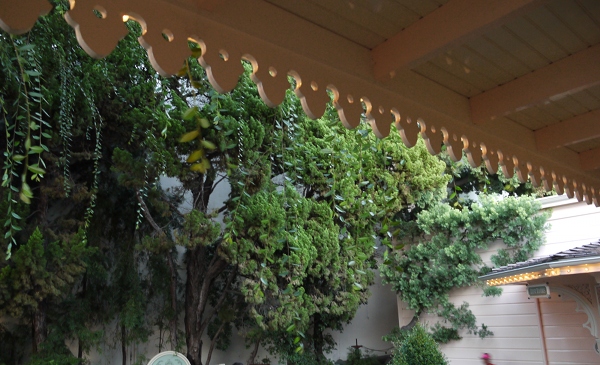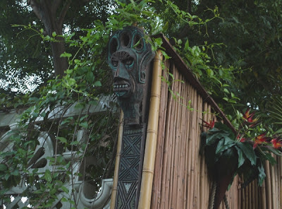 The ivy-covered terrace on the right is part of the Plaza Pavilion restaurant. The bamboo on the left is actually inside the waiting area for the Enchanted Tiki Room. In between we have this head.
