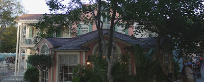 So the Riverbelle Terrace is the hardest-working transitional spot in Disneyland, bringing us from the untamed wilderness of the American West to the gentility of nineteenth-century New Orleans. It also bridges space and time to transition another untamed wilderness, Adventureland, cleanly and clearly into the exotic colors and textures of the Big Easy. In fact, the transition from Adventureland to New Orleans is clearly reflected in the Terrace's south-side architecture which, along with the Pirates of the Caribbean facade across the way, is to my eye the strongest anticipation of Magic Kingdom's remarkable Adventureland Veranda: