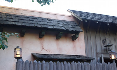 The top of the stockade fence. The lanterns can belong to either locality, but the brown clapboard siding to the right is absolutely part of Frontierland. Notice how the eaves under the roofs change from carved and ornate (exotic) to simple (homespun).
