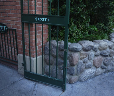 At which point this castle stonework continues into the Alice in Wonderland area. Meanwhile, across the way, the city park metal rails continue past and through the current "Pixie Hollow" area, once the former residence of the Monsanto House of the Future: