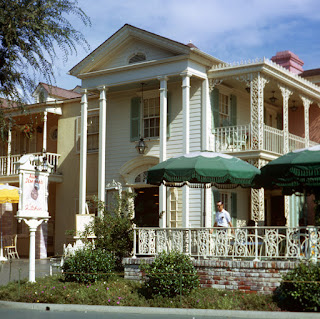 By the early 60s, the Aunt Jemima's had been expanded with a large show kitchen and glass walled seating area, covering up the former "Old West" architecture. At the same time, the Plantation House was pulled down. As early as 1962, this transitional space was being smoothed out in preparation for New Orleans Square. The new facade is now familiar to us as the Riverbelle Terrace: