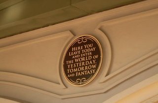 The entrance plaque is a keystone for understanding Disneyland's "magic window" organizing principle and how space is organized behind those points of juncture. Disneyland operates in methods similar to a cinematic cut, from one locality to another, and the effect is, at least partially, accidental. Magic Kingdom operates in a method most similar to a cinematic fade, and that was designed in from the start.
