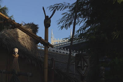 Once past Adventureland and on the "waterfront", the tropical elements are largely obscured by foliage, and the Pirates of the Caribbean, situated inside New Orleans Square but taking us to an exotic port-o-call, is an appropriate thematic transition. Recall that Pirates itself was placed in Adventureland in Florida and in a New Orleans subsection of Adventureland in Tokyo. All of these visual tropes and conceptual ideas are very malleable and blendable.