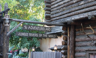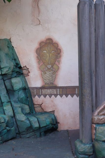 One thing I miss that they changed at the Frontierland/Adventureland bleed area at Disneyland, was the older sign that labeled the Woman's restroom. There, it was appropriately themed to Frontierland (put on the actual stockade wall you can see in the photo), with a bustled lady in 1880s wear.