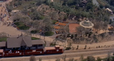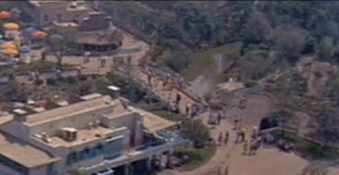 One of the quickest of these changes was to open up the small and crowded Adventureland to the west, connecting it with the most westerly portions of Frontierland. If we pull up Disneyland: People and Places, an early promotional documentary, we can see the path the wraps around the Aunt Jemima Pancake House from Adventureland there to the right and crosses then a bridge towards the train station (the Tom Sawyer Island rafts boarded below this bridge):