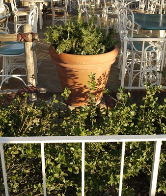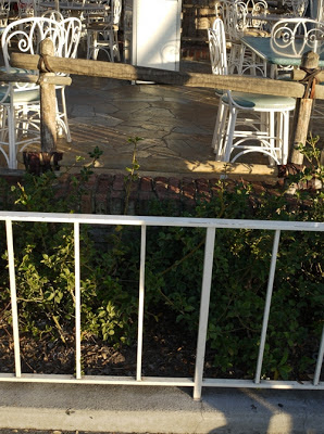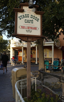 The nearby Stage Door Cafe sign visually integrates with Frontierland beyond it, but it's positioned at a pivot point in the area: behind it, the Frontierland visual vernacular continues towards New Orleans Square with a rough-hewn tree planter and crude fence even while gentrified plants and a white wrought iron rail are already transitioning us towards the "big city" just inches in front of it.