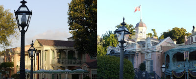 But also then notice how, just past the wrought iron, the facade transitions towards simple timbers and earth-toned colors. The "antebellum" timbers out in front of Aunt Jemima's front door aren't the Grecian columns like the Haunted Mansion has, they're in a more rustic style: