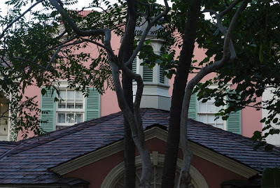 Architectural features above the central dining room look equally at home in New Orleans or an exotic outpost. The windows are nuetral: are they French Plantation or French Colonial? One has curtains, the other a simple shade. Colors compliment a wide variety of applications as they can be seen from inside three different "lands":