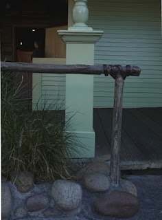 As you may have noticed by now, rails, fences, planters, and flowerboxes do an unusual amount of heavy lifting of the transition-spots of Disneyland. This may because these crowd control barriers generally are felt more than carefully studied: we interact with them and they set a tone without really being noticed in specific detail. Disneyland has a huge and astonishing variety of simply beautiful railings. Entering Frontierland, on the main "T" street, the rails and surface pavers look something like this: