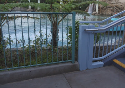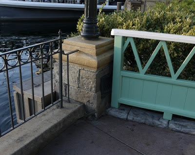 That potted plant can be said to be the very last point of Frontierland along the waterfront. Everything in sight from that point on is New Orleans until we get near the Haunted Mansion. The "Waterfront" area was radically revised by Imagineering in the early 90s, turning what was previously a pleasant, gentle slope down to the river into a hodgepodge of terraces, fences, lighting rig pits and other nonsense to support the installation of "Fantasmic". Here's the spot, near the Tom Sawyer Island raft landing, where the gentility of New Orleans begins to strip back down towards the "Frontierland" aesthetic: