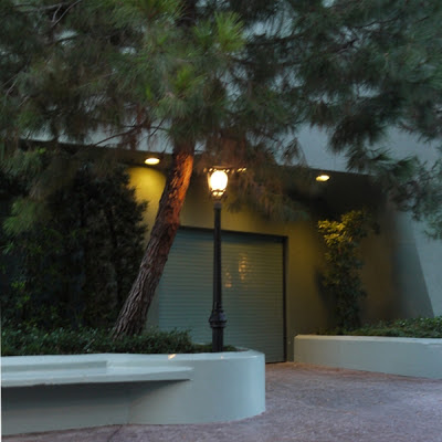 Yet continue along the south side of the Matterhorn and the similarities seem less convincing. Here's a European lamp and pole right up against Tomorrowland's streamlined planters and the very futuristic blank wall and bulkhead door:
