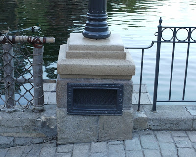 Just a few feet away, the large, irregular blocks of stone seen near Stage Door become formal, mass produced red bricks, heralding the start of the original 1955 "New Orleans Street". Increasingly complex rails and decorative details are evident:
