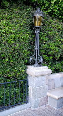 Above, we see the point where the Hub's neutral "city park" railings first intersect an architectural piece of Fantasyland, near the hub and visually linked to Sleeping Beauty Castle. Interestingly, this piece of Fantasyland then immediately ends, returning to the "city park" railings just a yard or so later. Fantasyland proper doesn't seem to begin until this point, which is celebrated with an elaborate light fixture: