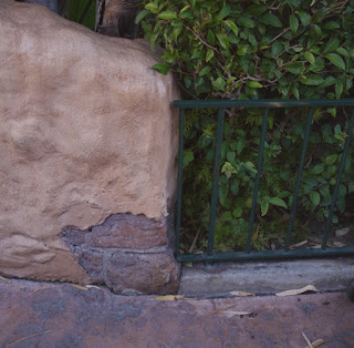 That's an obviously "Western" visual vocabulary. Plants poke out alongside a crude "path" that seems laid over them. Jumbles of rocks define the edges of the walkway, as if they were simply pushed there by foot and stage traffic. If we proceed around the side of the Golden Horseshoe near the Stage Door Cafe the visuals remain similar but now the rough wooden rails have become more formalized stone walls and planters. Large bushes help disguise the changing architecture. This is feet away from the start of the "New Orleans Street":