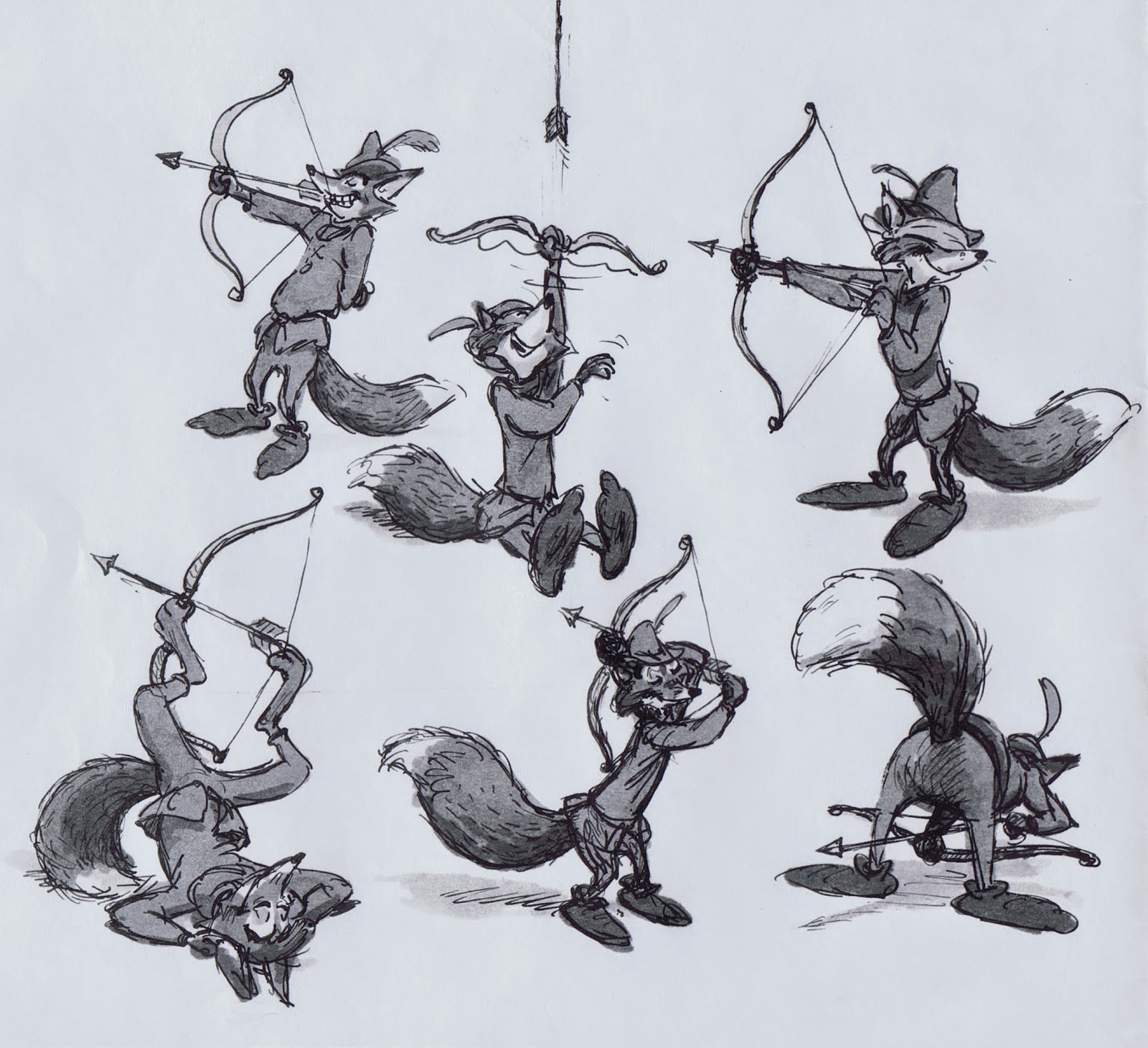 Ken's early design for Robin has a youthful appearance: a hat too large for his head, thin neck, and long nose (he also wears pants, which the final Robin does not, because what's better than a pantsless criminal?). This early model sheet has the cavalier attitude down pat - I especially like Robin shooting arrows with his feet. In a 1973 interview Milt Kahl casually revealed that they went through eight different models for Robin Hood in the film, and three different voices - Tommy Steele, Brian Cox, and the final choice of Brian Bedford. This early version is clearly the Tommy Steele version.